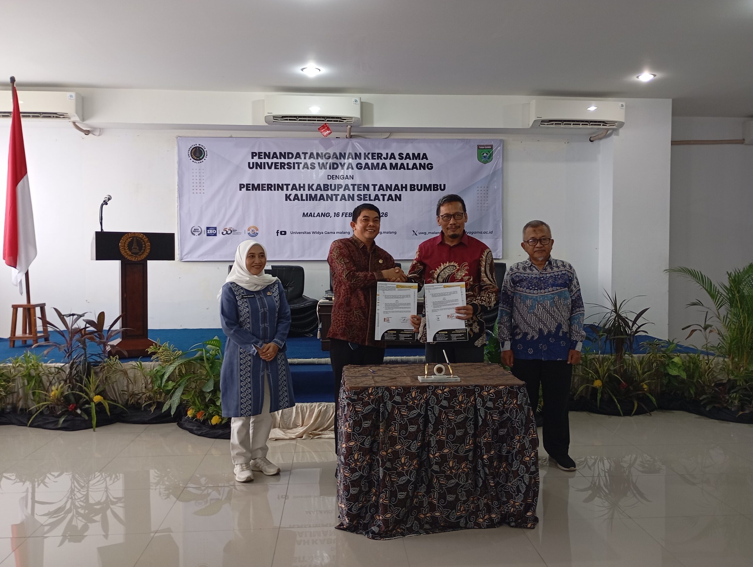 TBDC – Bupati Tanah Bumbu Andi Rudi Latif menandatangani Kesepakatan Bersama (KSB) dan Perjanjian Kerja Sama (PKS) dengan Universitas Widya Gama Malang, Senin (16/2/2026). Penandatanganan di kampus perguruan tinggi tersebut menjadi langkah strategis memperkuat sinergi pemerintah daerah dan dunia akademik dalam mendukung pembangunan berbasis teknologi dan inovasi.